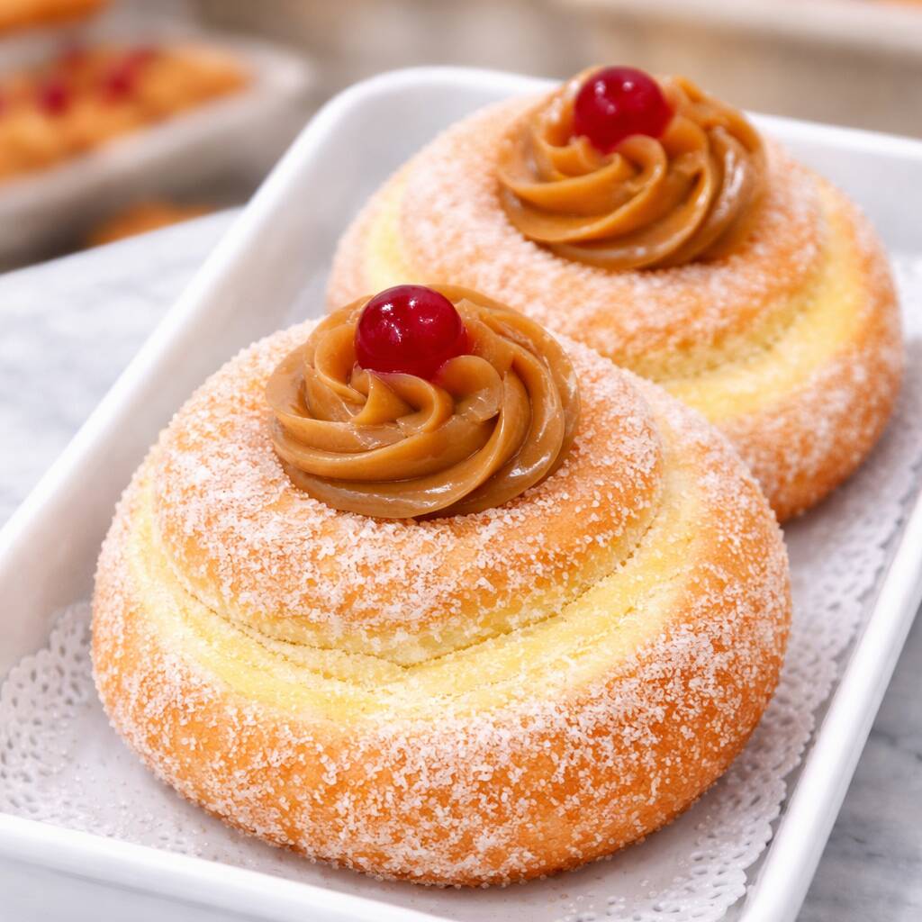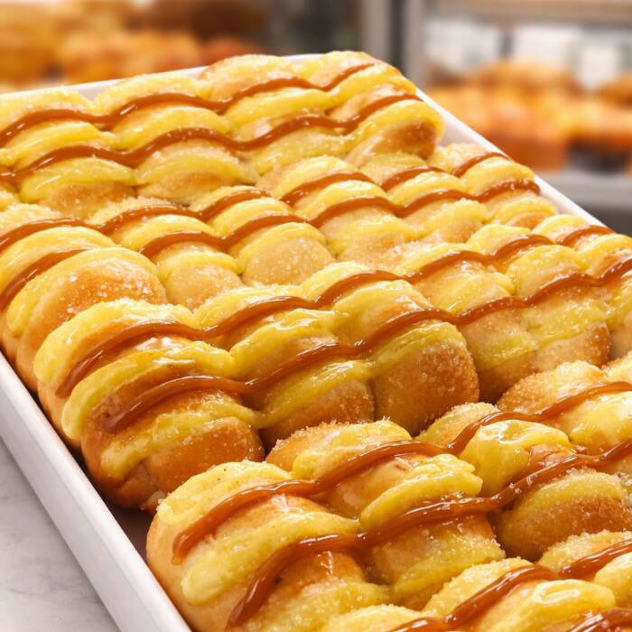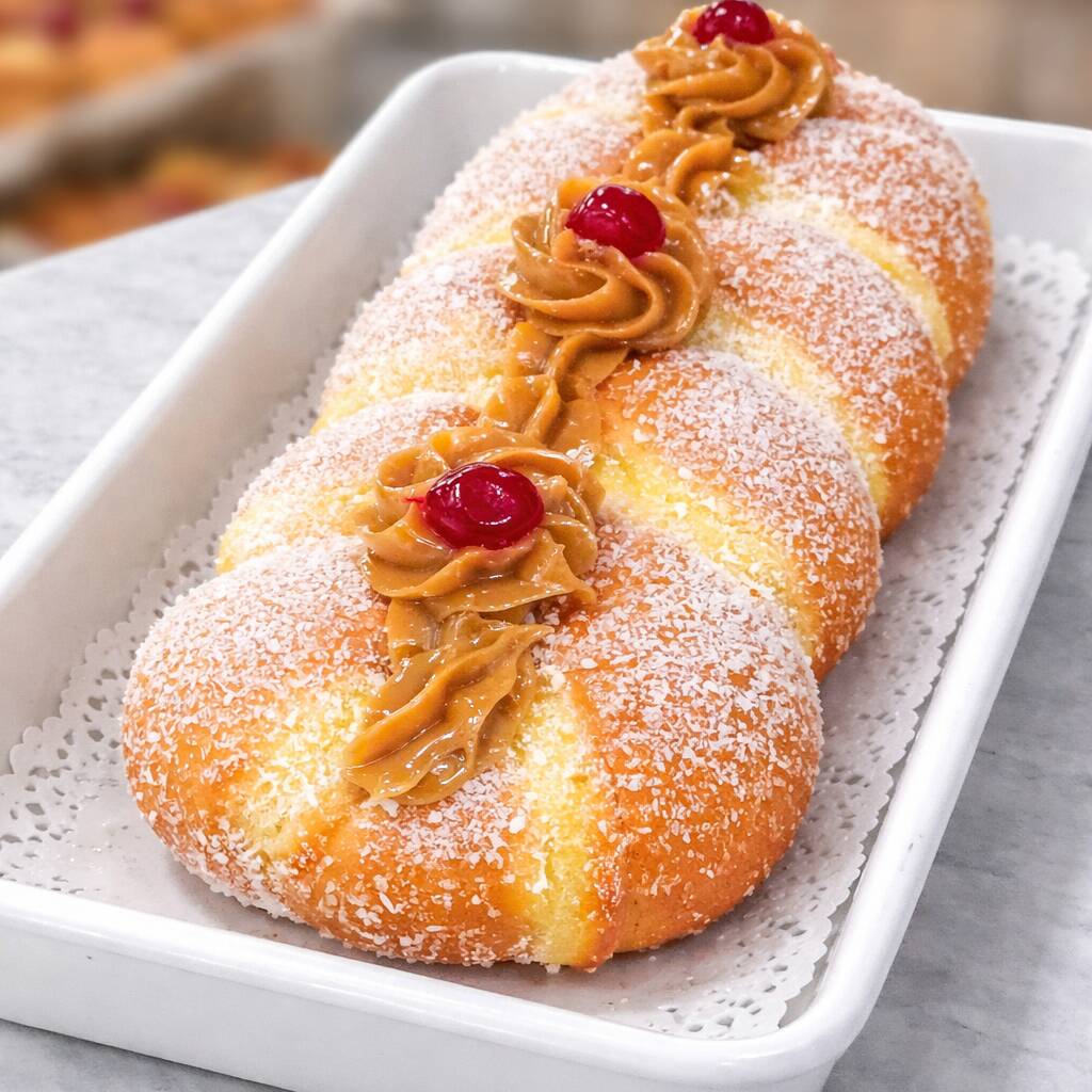 Pão doce, fofinho, com creme, coco e generosa cobertura de doce de leite!