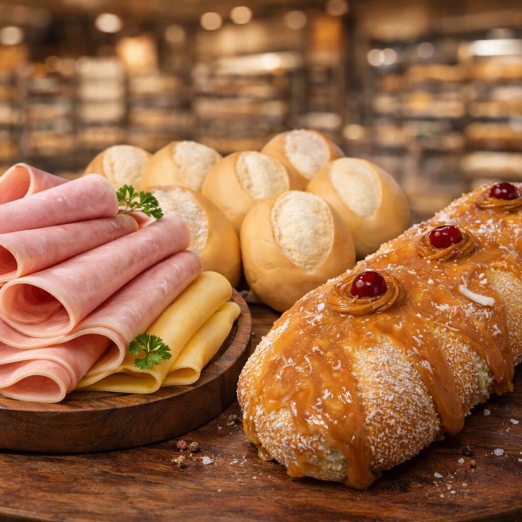 Nem café da manhã, nem lanche. É intervalo. Algo doce e algo salgado. Equilíbrio! 100g Presunto, 100g de Mussarela, 1 Pão doce trança grande limão, doce de leite ou maracujá. 5 pães francês. (O Pão Trança sera enviado de acordo com o nosso estoque no momento do pedido)