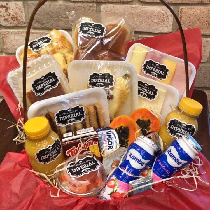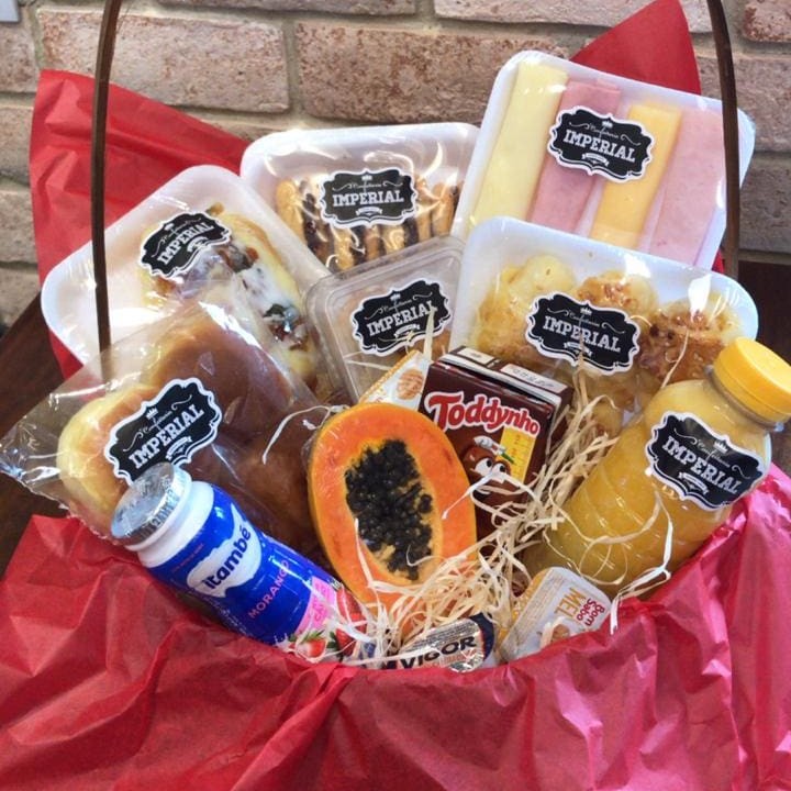 2 Suco de Laranja 300ml; 2 Iogurtes; 1 Toddynho; 1 Salada de frutas; 4 Brioches; 6 pães de queijo; 1 Pão doce; 1 Bolo; Biscoitos Amanteigados; 2 Fatias de Queijo; 2 Fatias de Presunto Sadia; 2 Fatias de Peito de Peru Sadia; 2 Fatias de Queijo Minas; 2 Polenguinhos; 1 Mamão Papaya; 10 mini croissant recheado; 2 Manteiga sache; 1 Geleia Queensberry 180g 2 Mel Sache.