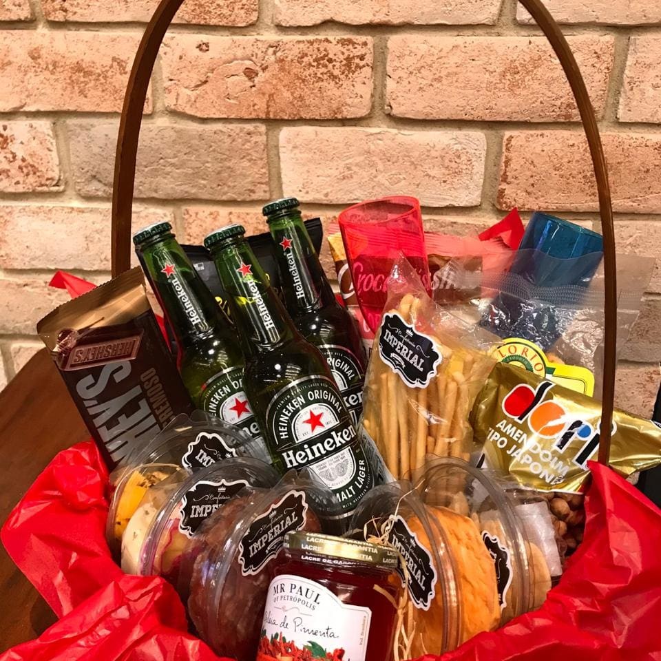 Uma linda cesta contendo : 6 Unidades de cerveja 330 ml ( Heineken ou Corona ) 1 pct de Amendoin 20g 1 bol de Salaminho Italiano ± 100g 1 bol de Queijo Parmesão com Azeite ± 100g 1 pcte de pizza seca da casa . 1 pcte de Grissini Imperial ± 200g 1 pcte de Torrada da casa . 1 bol de Pasta da Casa ± 100g