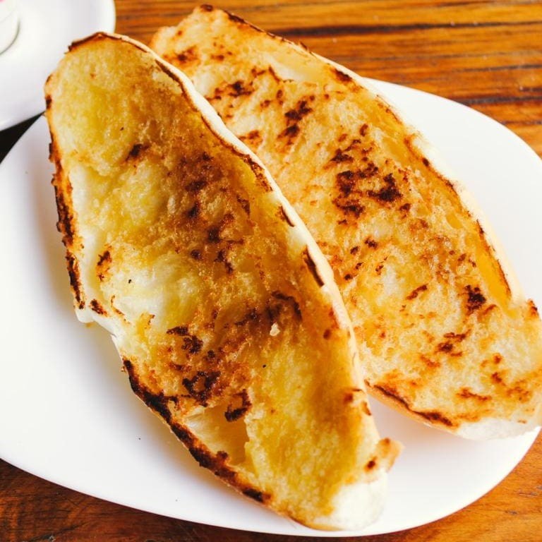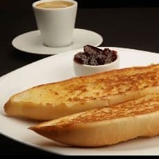 Foto ilustrativa. Café expesso + baguete na chapa + geleia