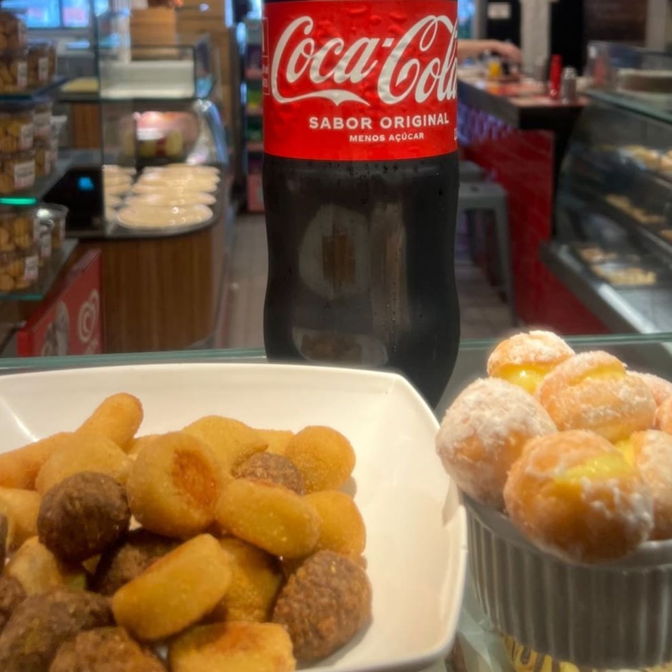- 25 salgadinhos fritos (sortidos) - 1 coca cola de 2 litros - 10 mini sonhos (sortidos)