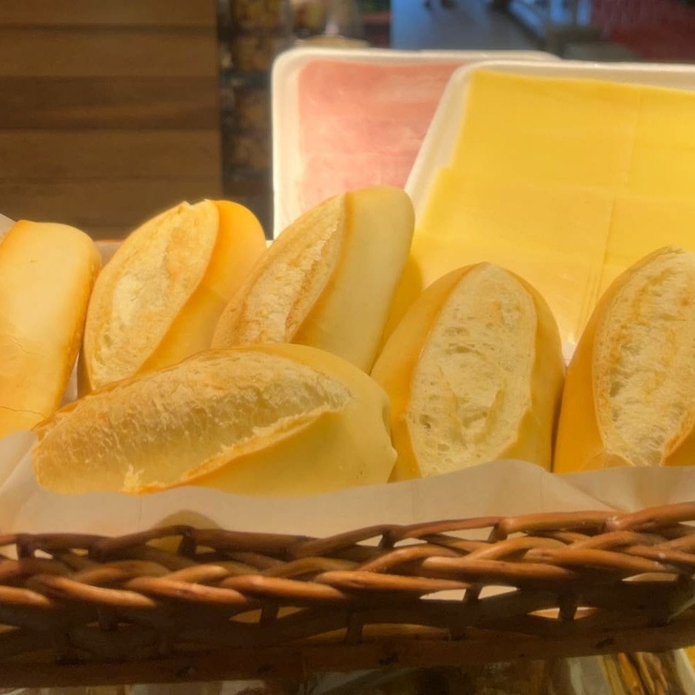 Itens: 10 pães franceses 8 joelhinhos mix de sabores 8 mini croissants de queijo minas 1 bolo pequeno 6 mini sonhos 1 requeijão 150g de queijo prato 150g de peito de peru 1 suco de laranja de 500ml 4 manteiguinhas 2 geleinhas