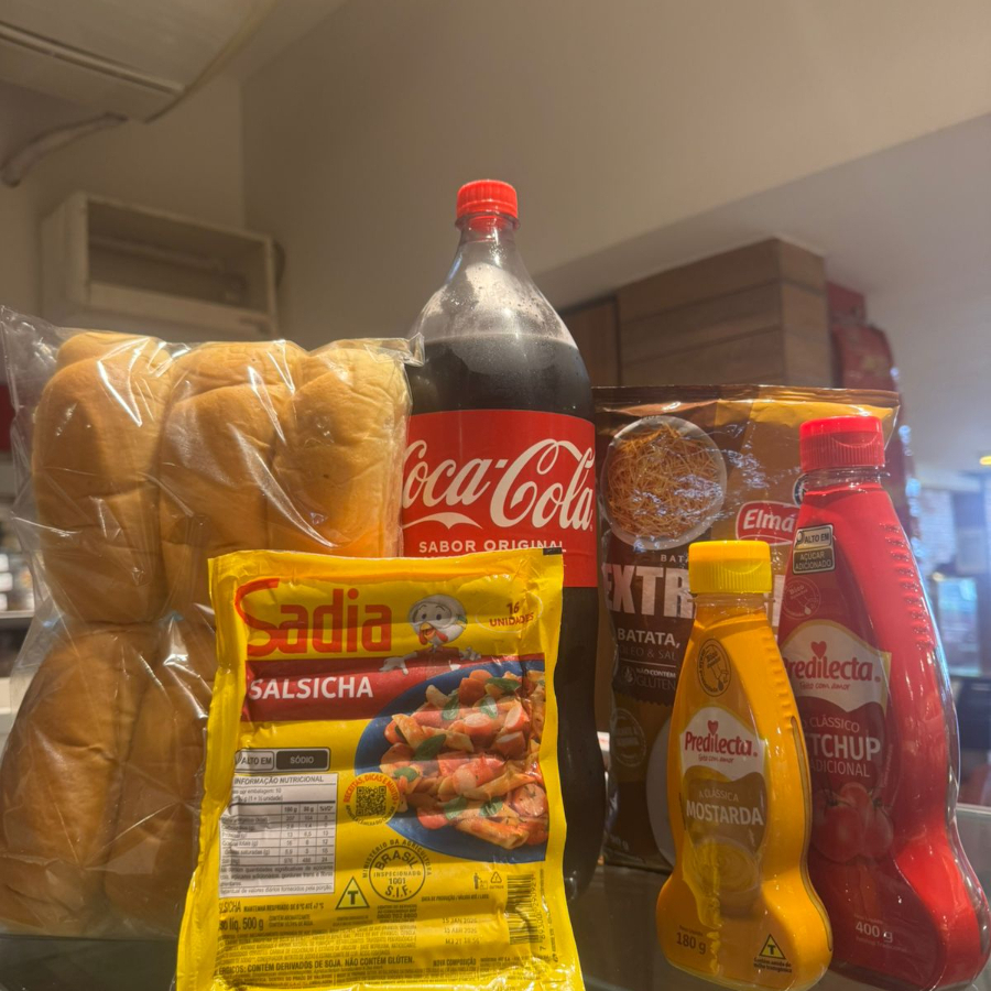 1 PCT DE SALSICHA 500G+1 PCT BATATA PALHA+MOSTARDA180g+KETCHUP180g+6 MINI CARECAs+1 COCA 2L