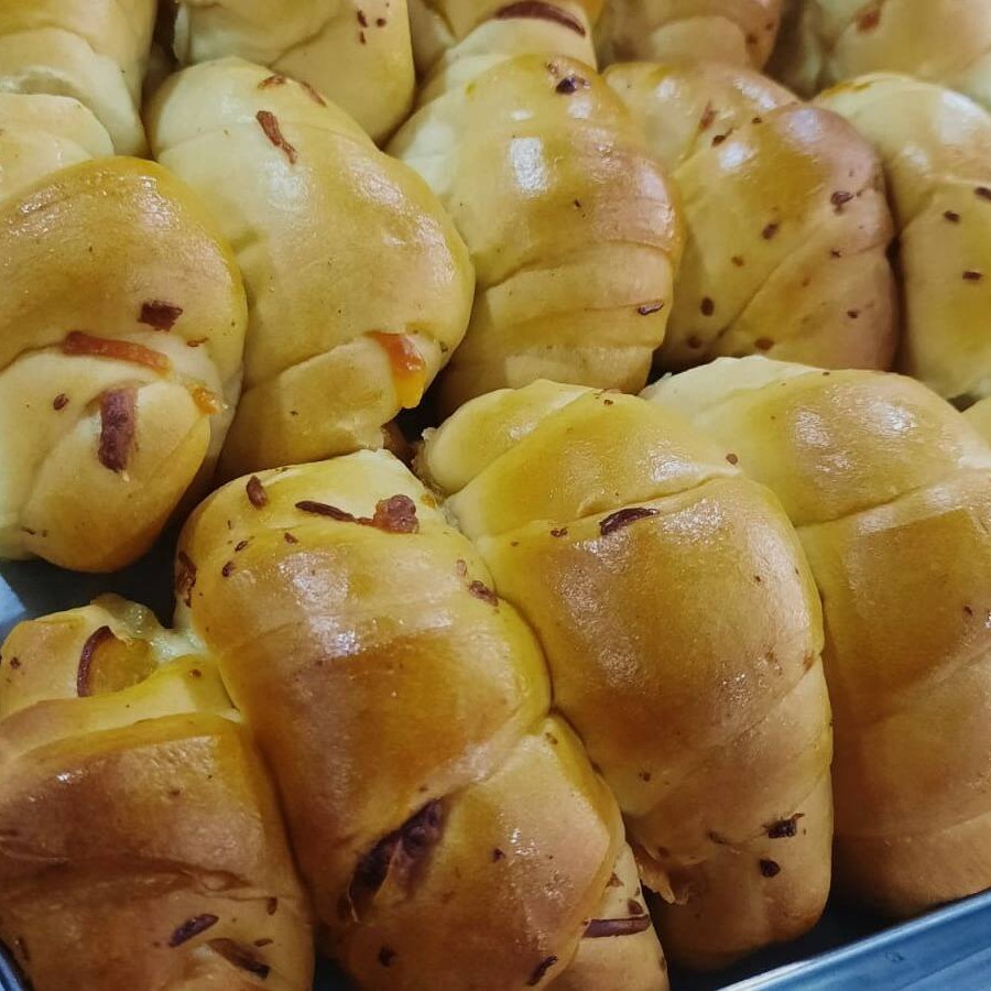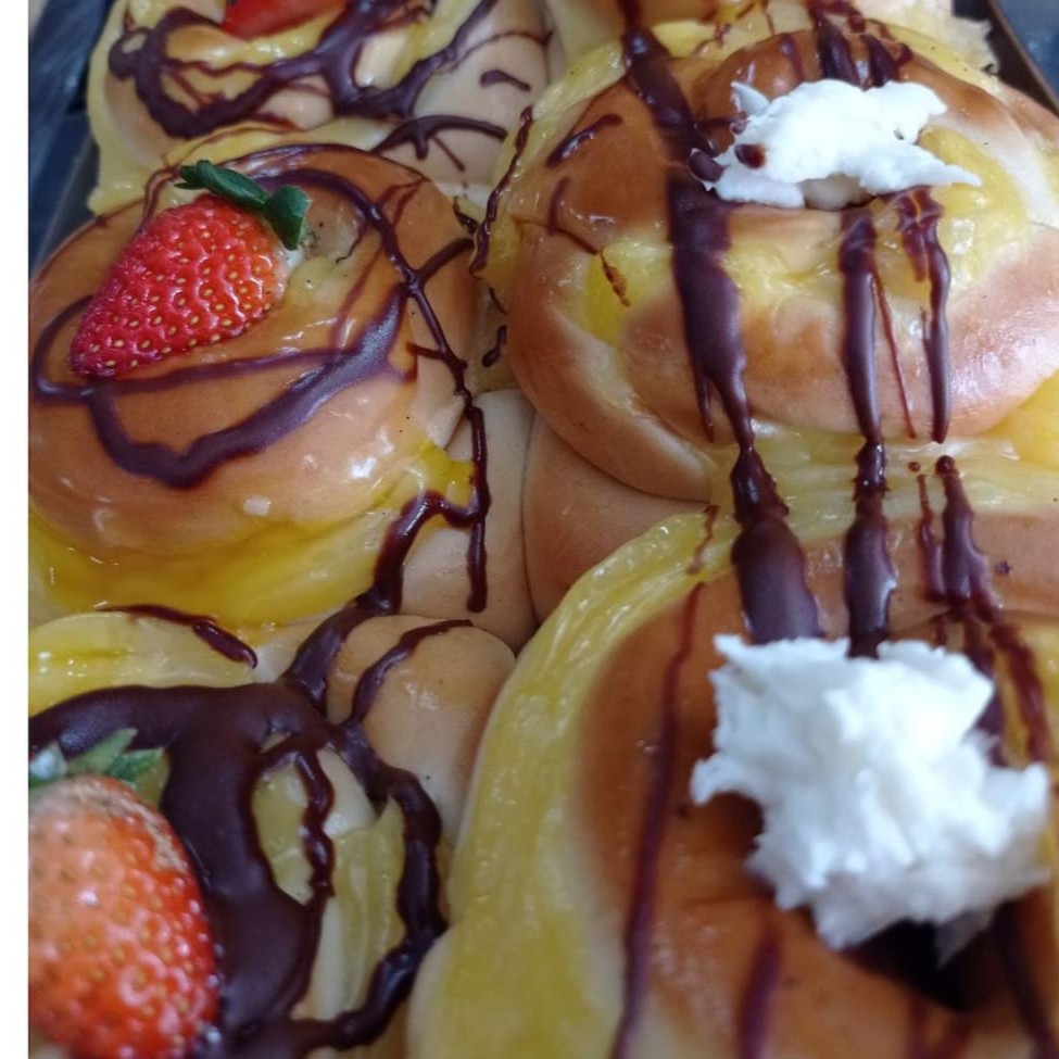 Pão doce caracol, ou nó Obs: imagem ilustrativa. Possui diversas confeitarias por cima.