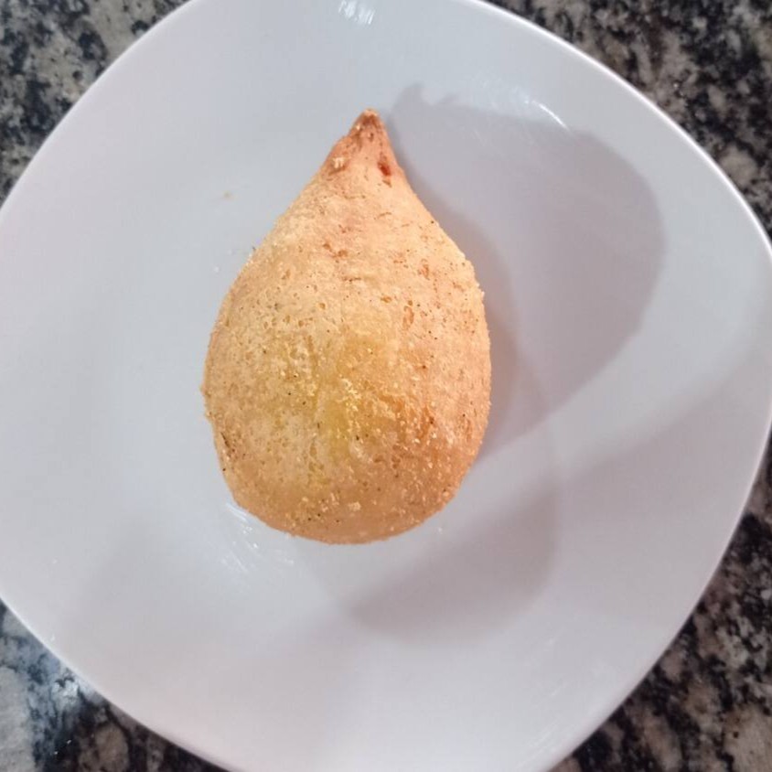 Unidade de coxinha de frango caseira, feita com frango desfiado e tempero de vó