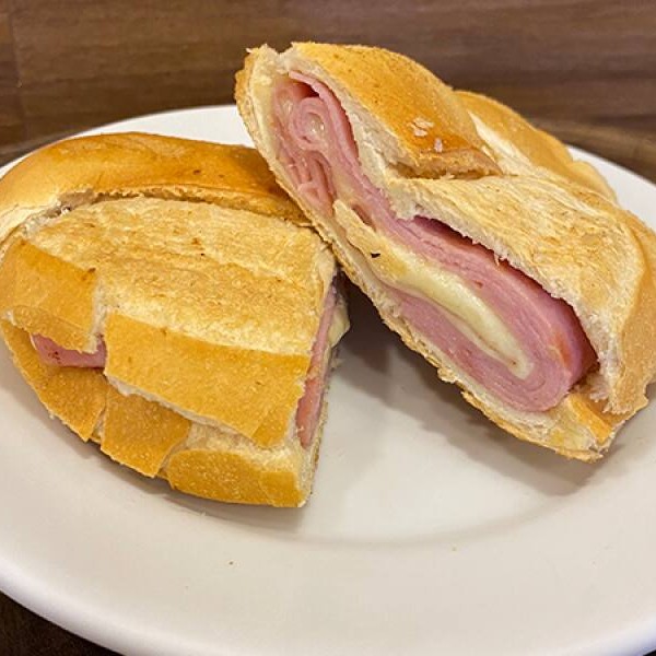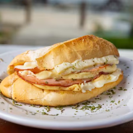 Pão de forma na chapa com fatias de queijo prato e presunto