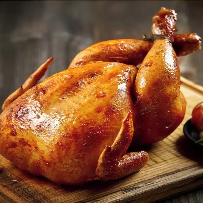 Frango dourado no ponto. Acompanha farofa e 5 pães franceses