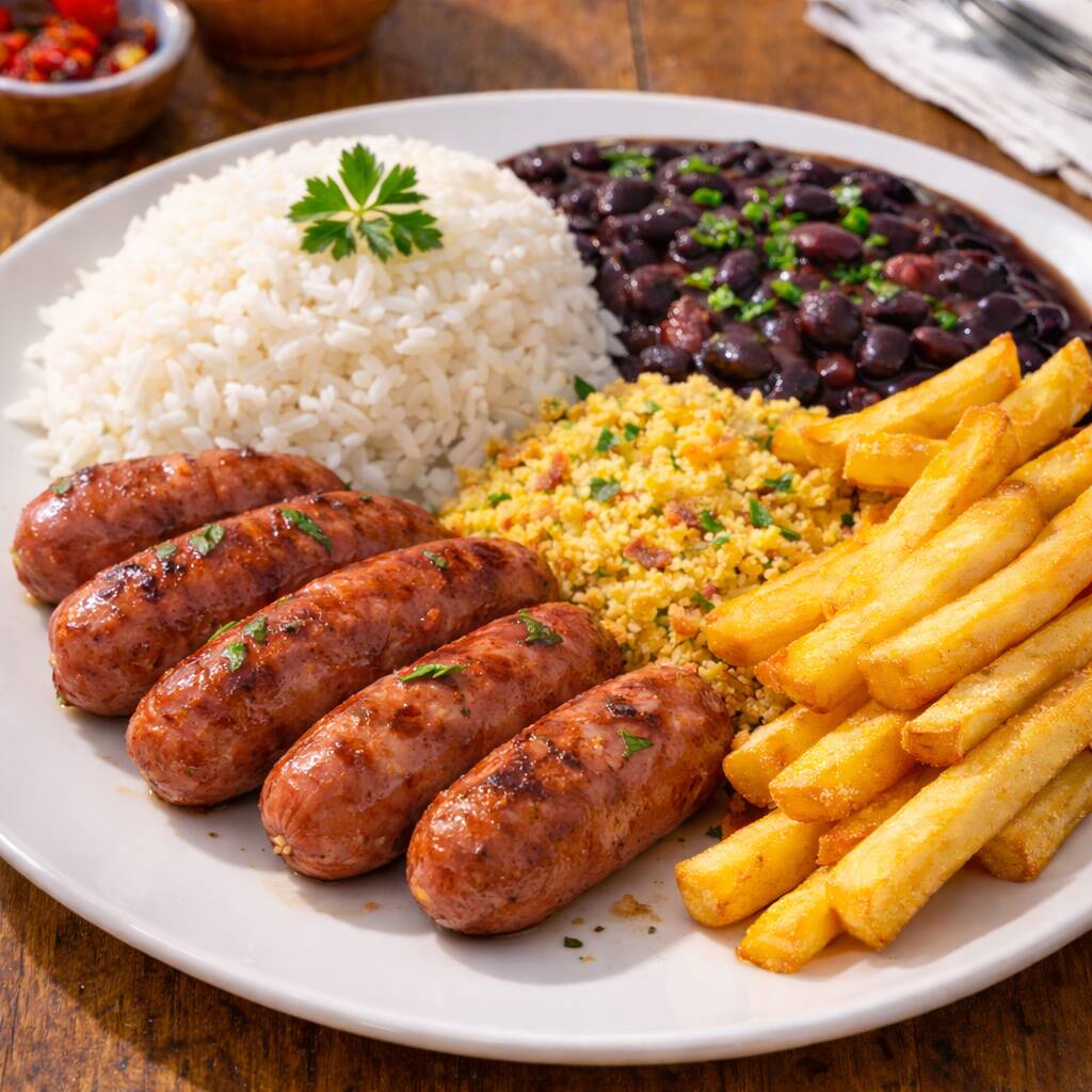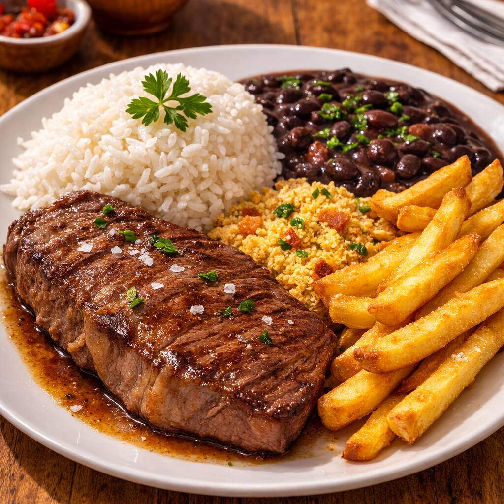 Acompanha arroz, feijão, farofa e batata frita