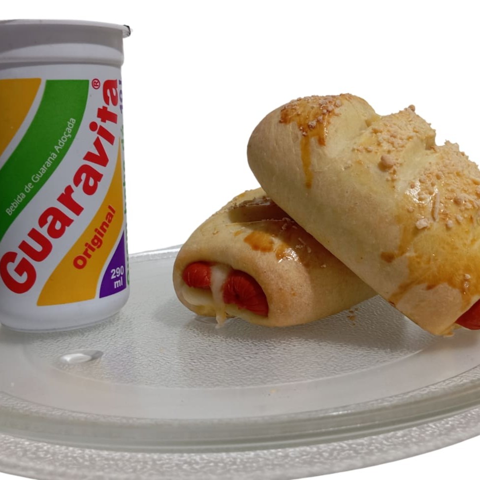 2 uni. Cachorro quente de forno com queijo, presunto, Catupiry e salsicha. 1 - Guaravita 290 ml