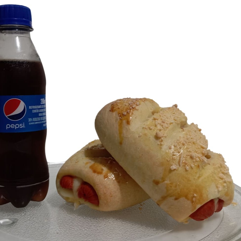 2 uni. Cachorro quente de forno com queijo, presunto, Catupiry e salsicha. 1 - Garrafa de Pepsi 200ml