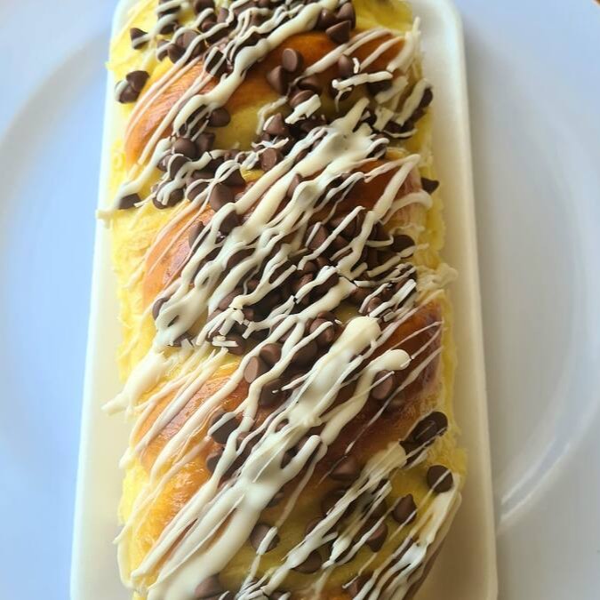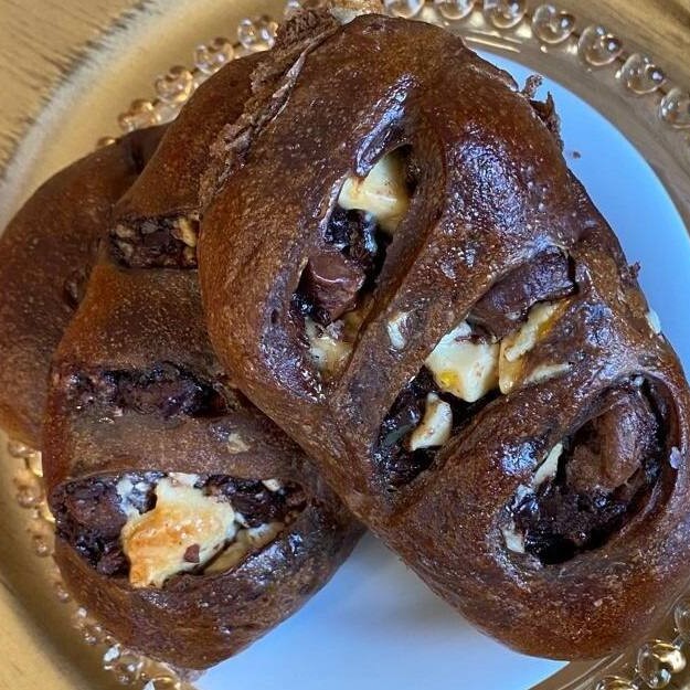 Delicioso pão feito com massa de chocolate recheado com muito chocolate branco, chocolate ao leite e meio amargo.