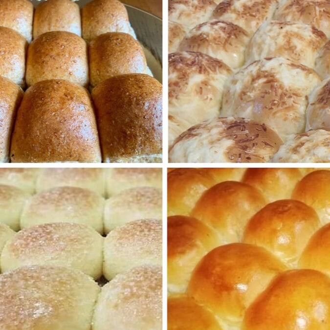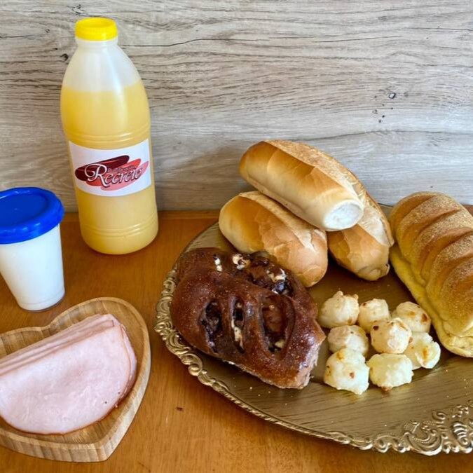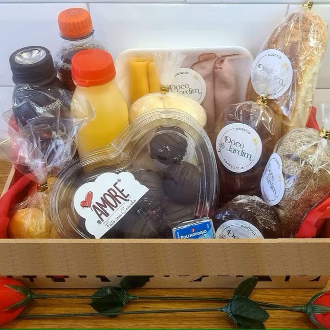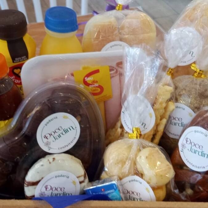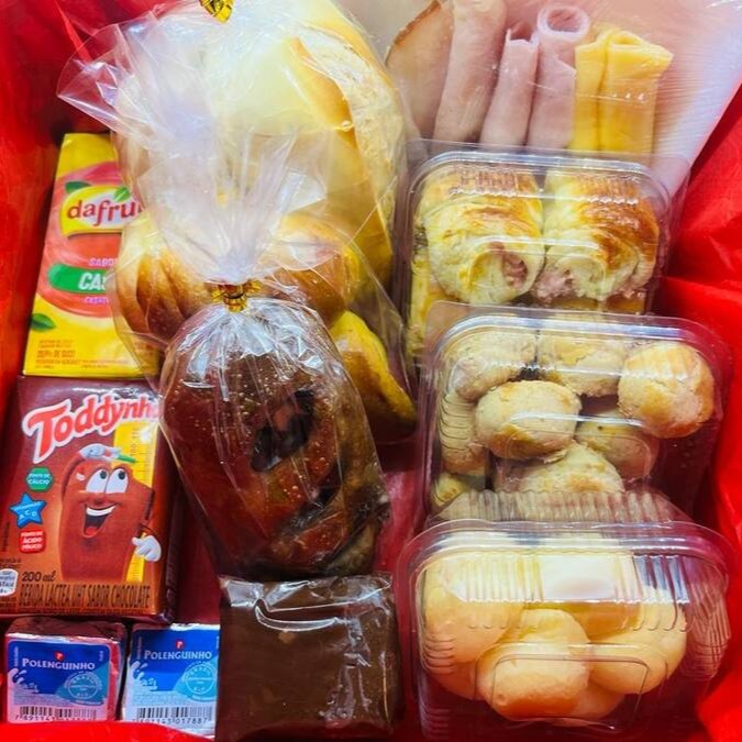 Conteúdo: 1 pote com 6 carolinas recheadas, 1 pão australiano, 1 pão semi italiano, 1 pão francês, 4 mini pães de leite, 6 pães de queijo, 1 pão 3 chocolates, 1 pão de mel, 1 suco de laranja 300 ml, 1 chá gelado, 1 cappucino, 1 bandeja de frios (presunto, peito de peru defumado e queijo), 2 queijinhos tipo Polenguinho.