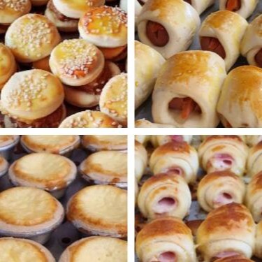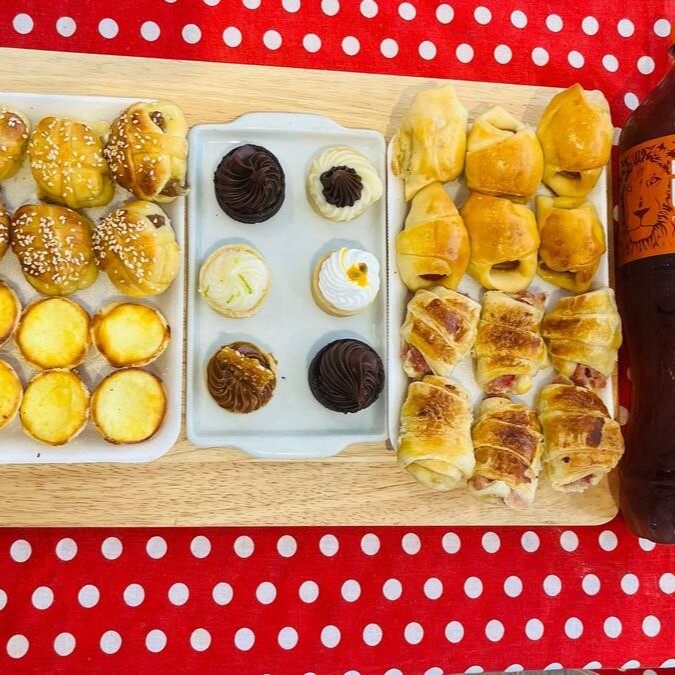 Kit com 6 hamburguinhos, 6 cachorrinhos, 6 croissants de queijo e presunto, 6 empadinhas de queijo, 6 mini tortinhas sortidas e 1 bebida de 1,5l (refrigerante ou Mate) a sua escolha.
