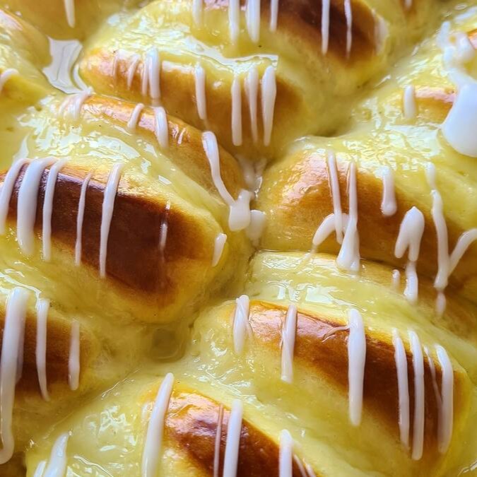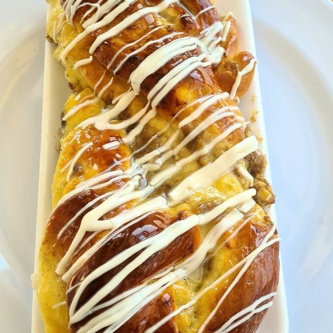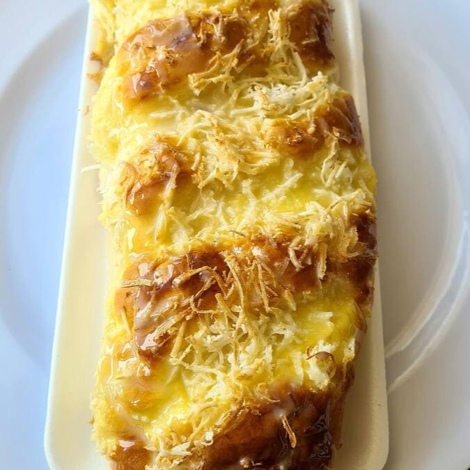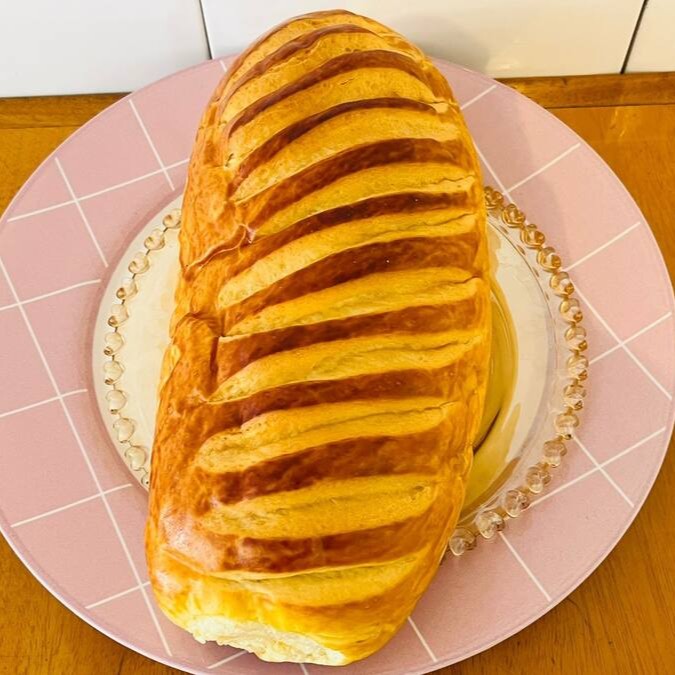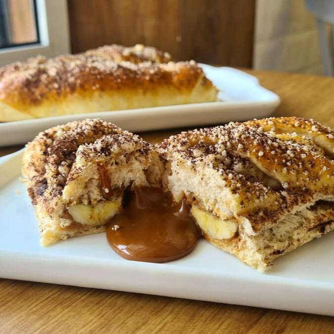 Delicioso pão com recheio de banana, doce de leite e canela, com uma farofinha doce na cobertura.