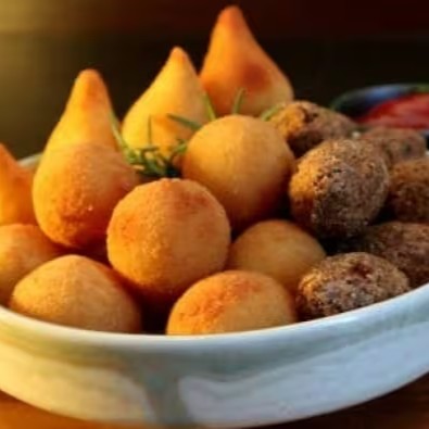Kit especial de petiscos, com 30 salgadinhos variados fritos, 10 mini empadas de queijo, 10 salgados assados com pasta de alho e mussarela e 1 bebida de 1,5l a sua escolha.