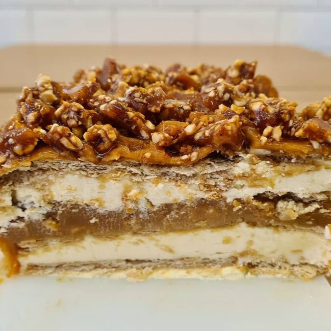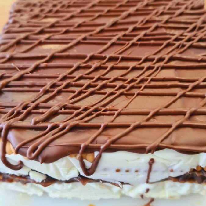 Pavê com delicioso creme amanteigado e biscoitos. Recheada de doce de leite e coberta com doce de leite e crocante de amendoim.