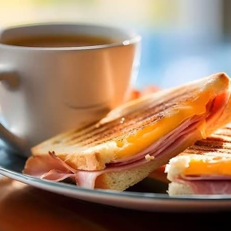 Misto quente feito com pão de forma na chapa com manteiga, presunto e queijo prato ou mussarela.