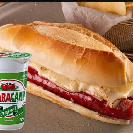 Delicioso sanduíche com 2 linguiças finas cobertas com queijo prato ou mussarela no pão francês + Guaraná Natural 285ml