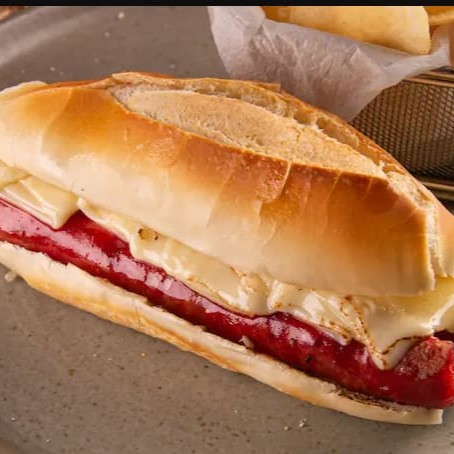 Delicioso sanduíche com 2 linguiças finas cobertas com queijo prato ou mussarela no pão francês.