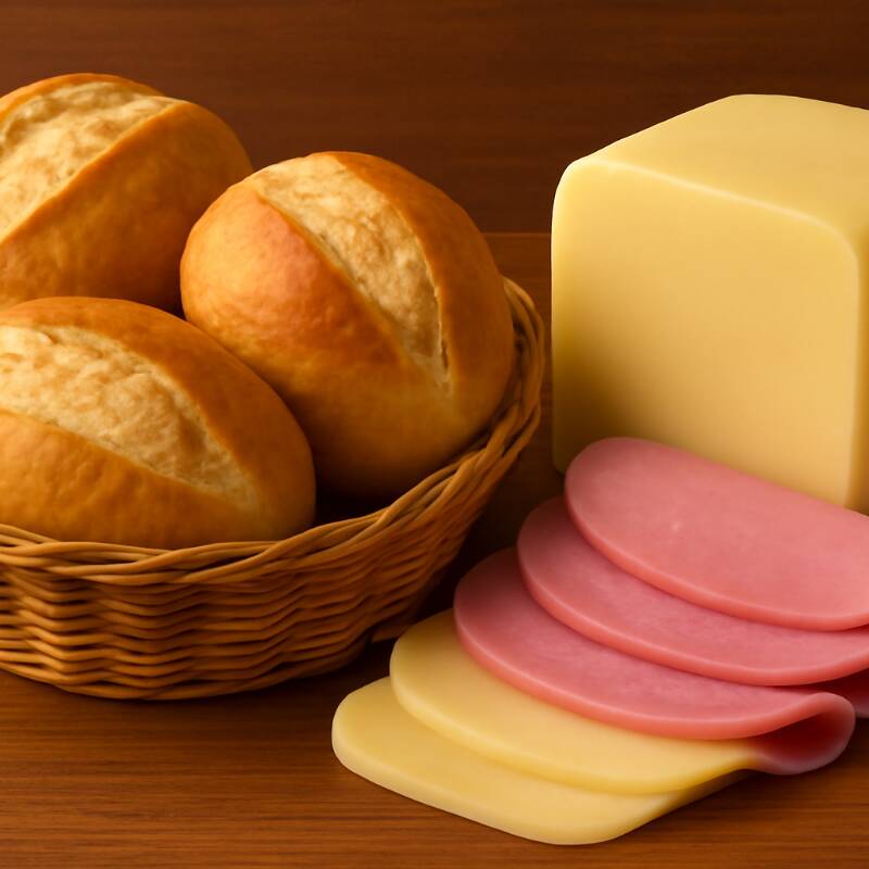 2 pães com presunto e queijo prato ou mussarela. - Escolha o preparo frio ou na chapa.