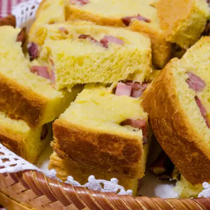 Pão português, assado na forma do pão petrópolis, com azeite o ovos, recheado com bacon e calabresa escaldados