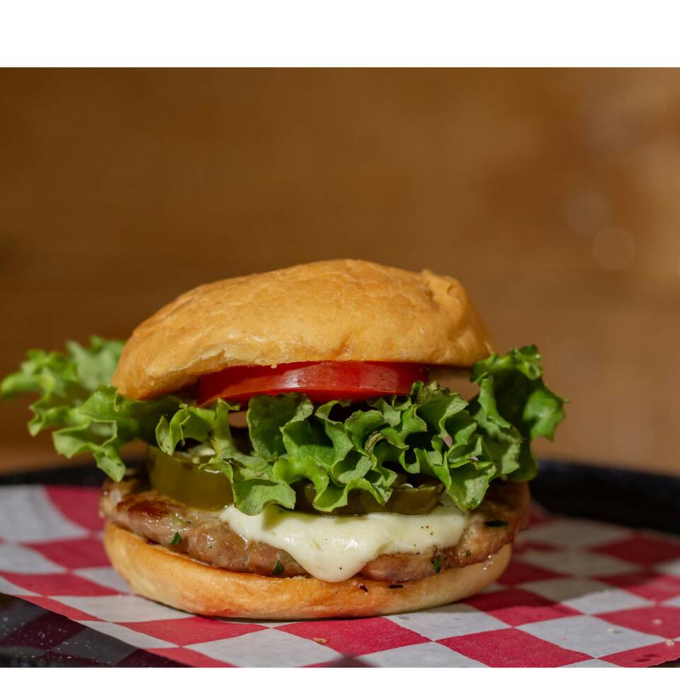 Carne de hambúrguer, queijo mussarela, queijo cheedar e tomate