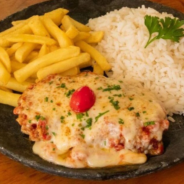 Carne moida , gratinado com queijo mussarela ralado, arroz, feijão, farofa e batata frita.