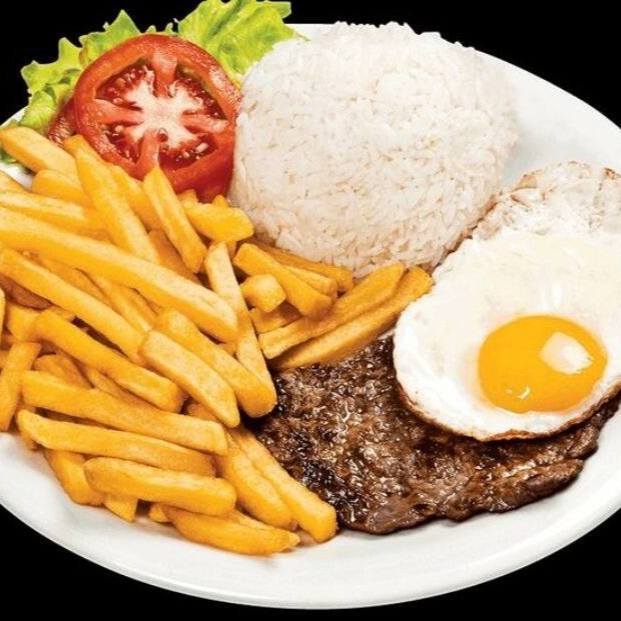 Arroz, Batata Frita, Salada Verde Molho Especial da casa, E Molho a Rose.