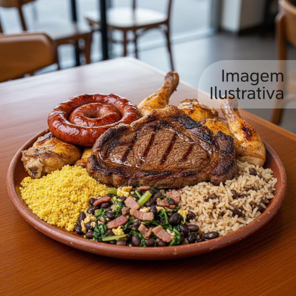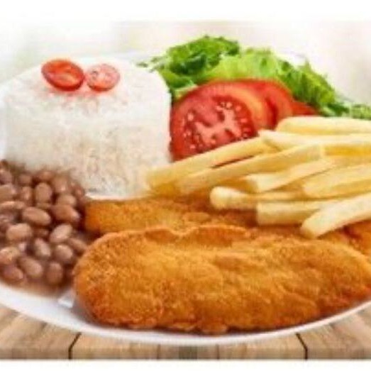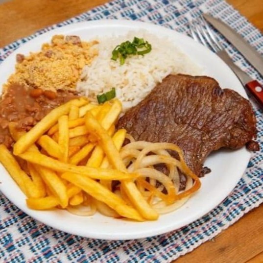 Arroz, Feijão, Farofa, Batata Frita.