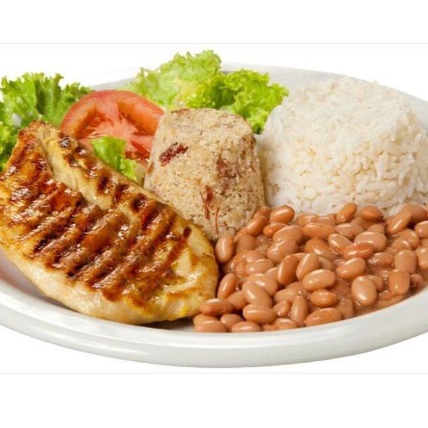 frango grelhado, arroz, feijão, farofa e batata frita