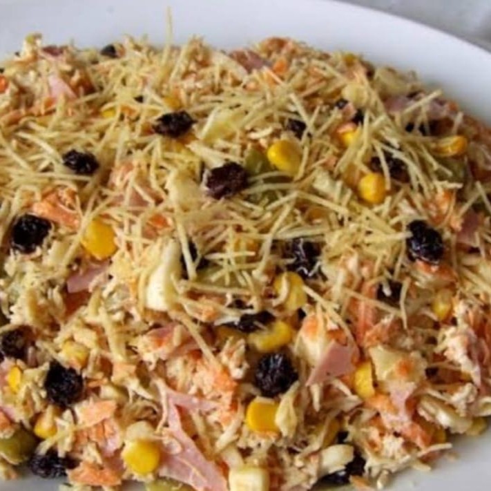 Cenoura, Frango desfiado, Queijo, Presunto, Azeitona, Milho e Batata Palha. Maionese.300 ml