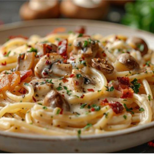 MACARRÂO ESPAGUETE, FRANGO DESFIADO, BACON, QUEIJO MUSARELA RALADA, E MOLHO BRANCO.