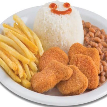 nuggets de frango arroz, feijao, farofa e batata frita.