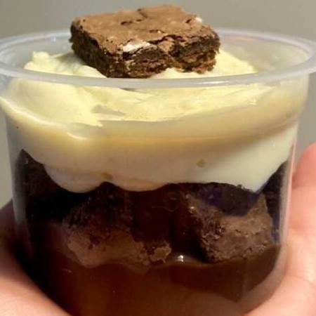 Nosso delicioso creme de chocolate feito com cacau 50% , avelã, Amendoim e pedaços macios do nosso brownie uma explosão de sabor para quem é amante de chocolate .