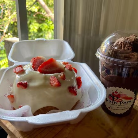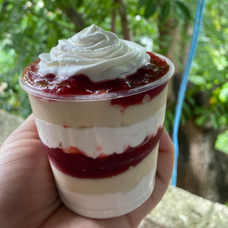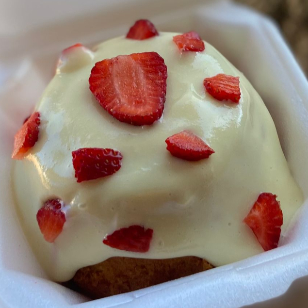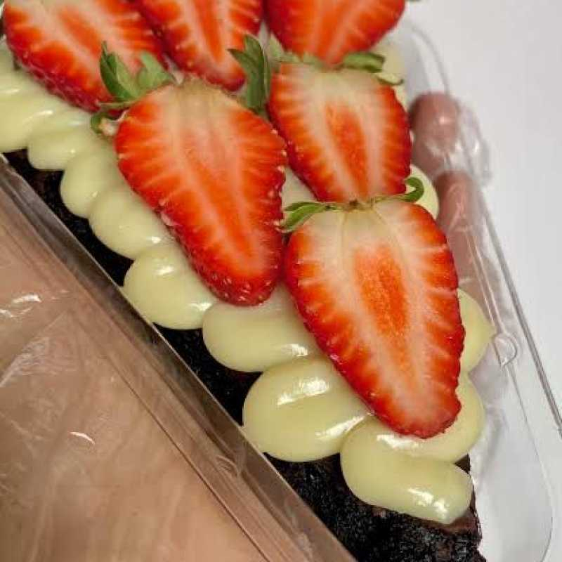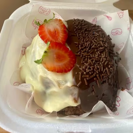 Uma deliciosa massa de baunilha bem molhadinha , e dentro pedacinhos de morango , pra finalizar uma cobertura de Ninho. (Pesando Aprox 250g) Serve 1 pessoa