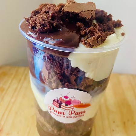 Nosso copo vai com camadas intercaladas do nosso creme de Ninho e creme de chocolate , e pedaços macios do nosso brownie feito com chocolate 50% cacau ou se preferir com massa de bolo de chocolate .