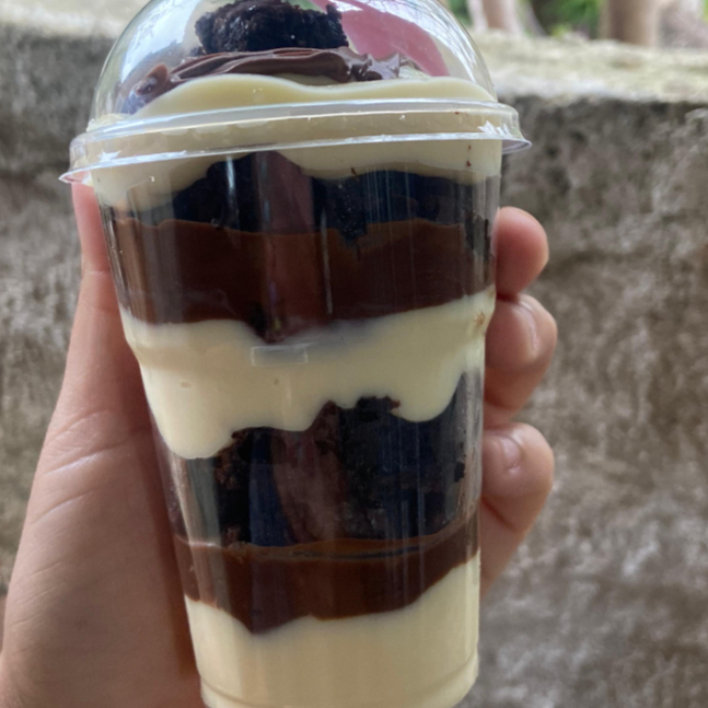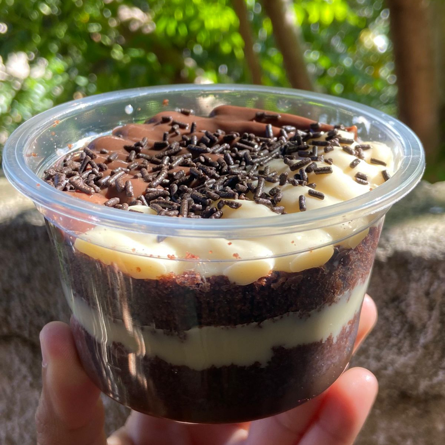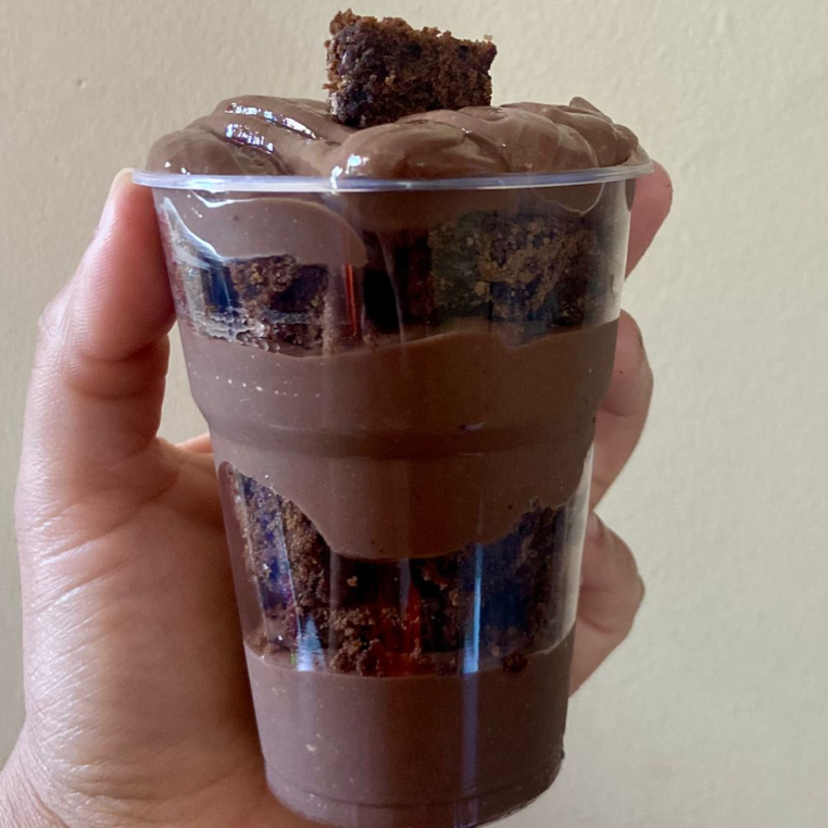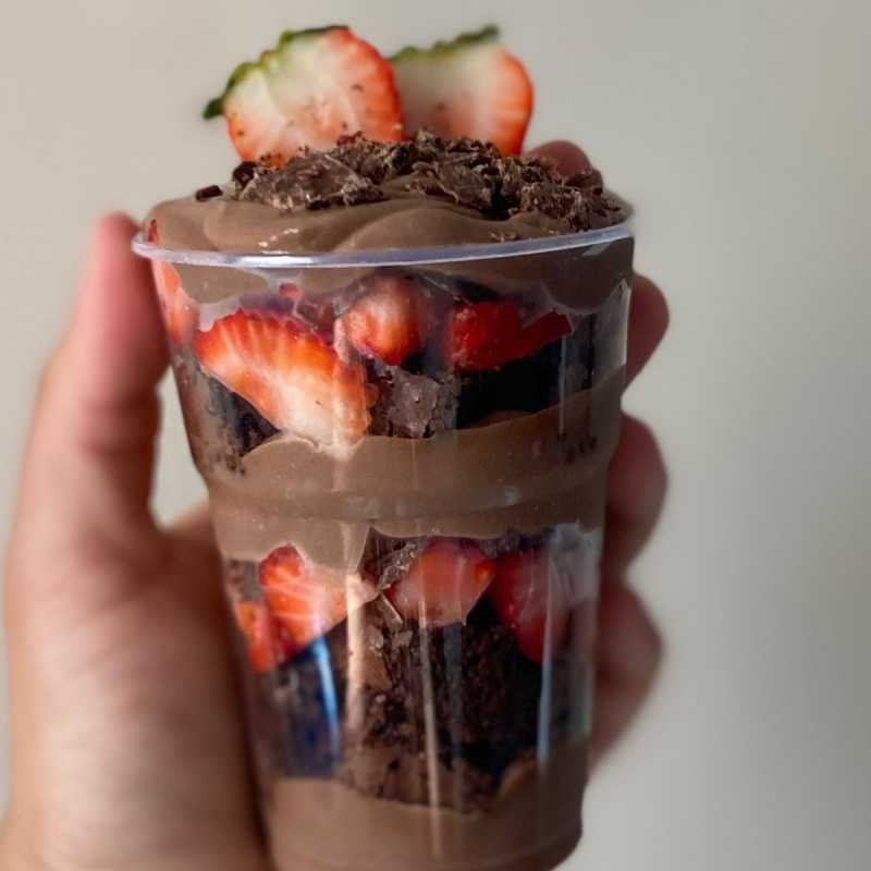 Copo recheado com brownie macio ou bolo de chocolate , creme de chocolate, raspas de chocolate e morangos frescos. Uma explosão de sabor em cada colherada! 🤎