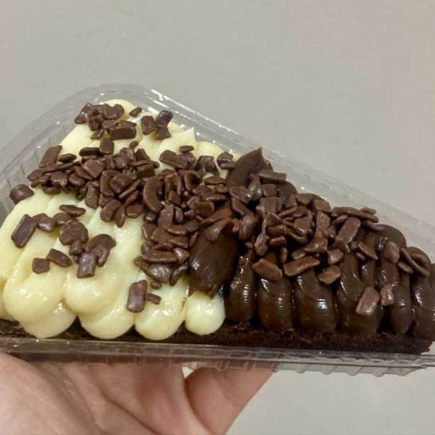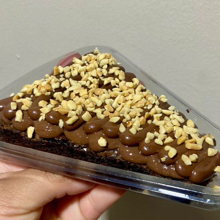 Fatia de brownie super macia e chocolatuda, recheada com creme de chocolate e avelã e finalizada com pedacinhos de amendoim. Uma combinação perfeita de textura e sabor.