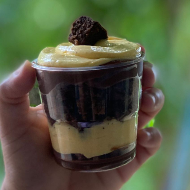 Nosso Copo da Felicidade Marabrownie é feito com brigadeiro cremoso de maracujá, camadas generosas de brownie macio, finalizado com creme chocolate. A combinação perfeita entre o azedinho do maracujá e o doce intenso do chocolate, ideal para quem ama uma sobremesa marcante e irresistível.
