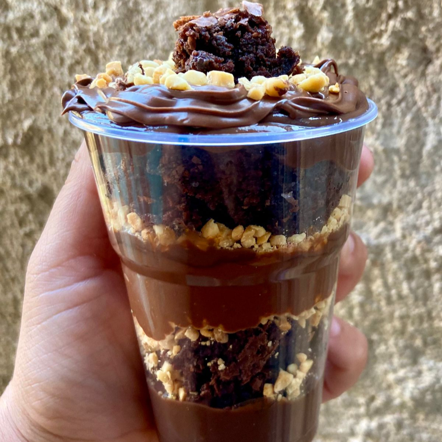 Brownie úmido e saboroso, intercalado com creme de ninho e finalizado com avelã. Um copo que derrete na boca e conquista todos os sentidos! 🌰✨