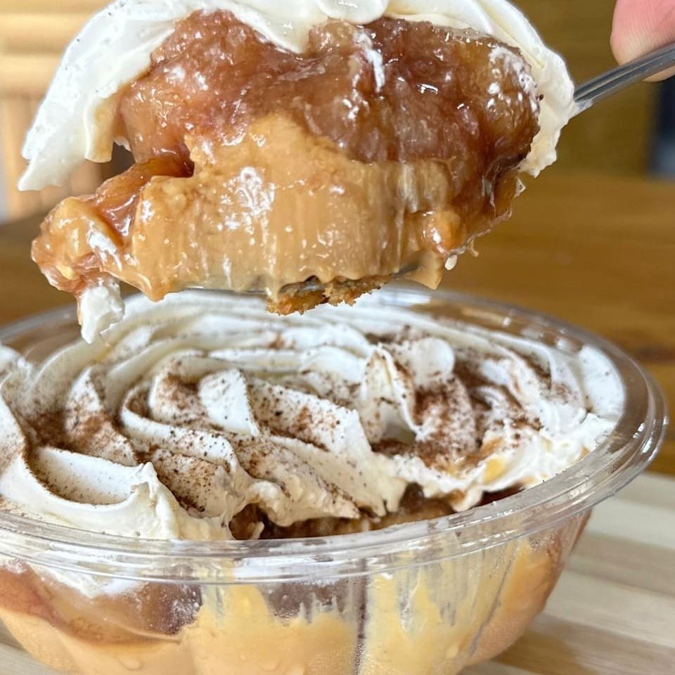 Farofa de biscoito, cremoso de doce de leite, banana caramelizada, chantinho finalizado com canela