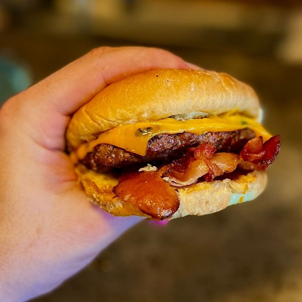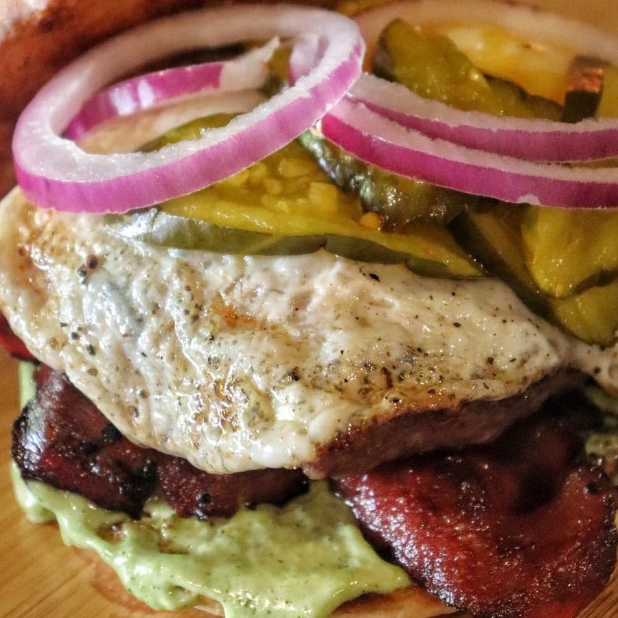 Pão brioche, carne 180gr, creme de cheddar, picles caseiro de pepino, maionese verde, ovo frito, bacon e cebola roxa