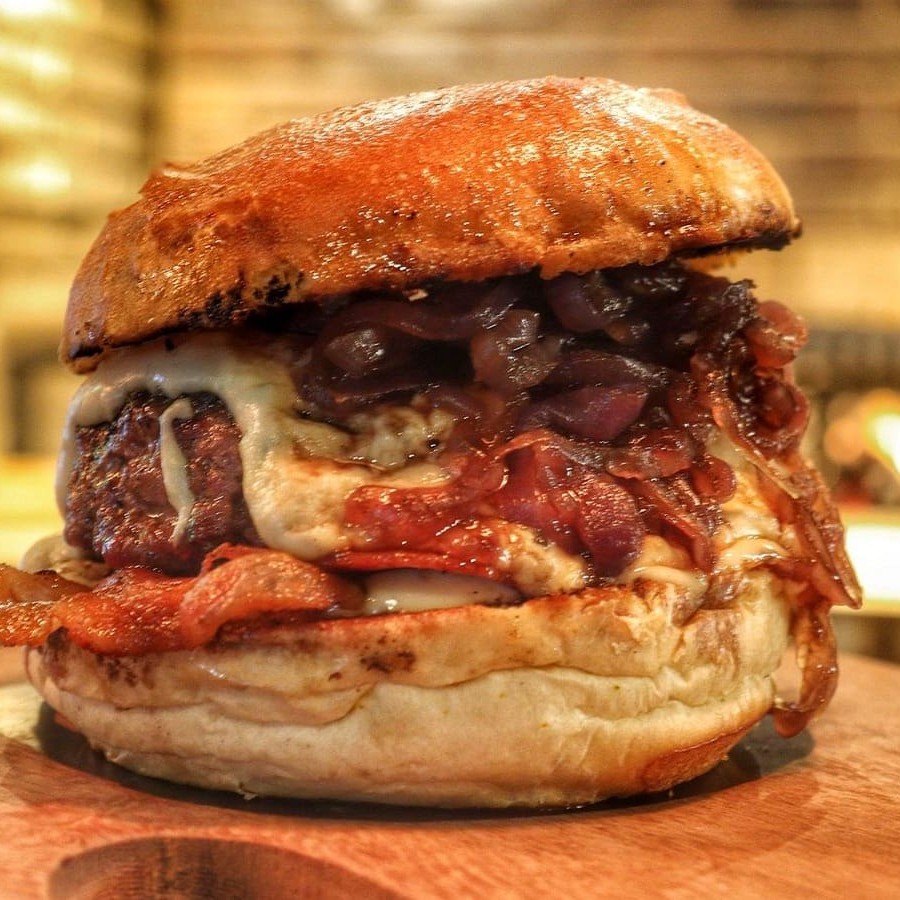 Pão de brioche ,carne 200gr 100% angus certificado, cebola caramelizada no shoyo, maionese de olho poró, creme de gorgonzola e bacon Vpj