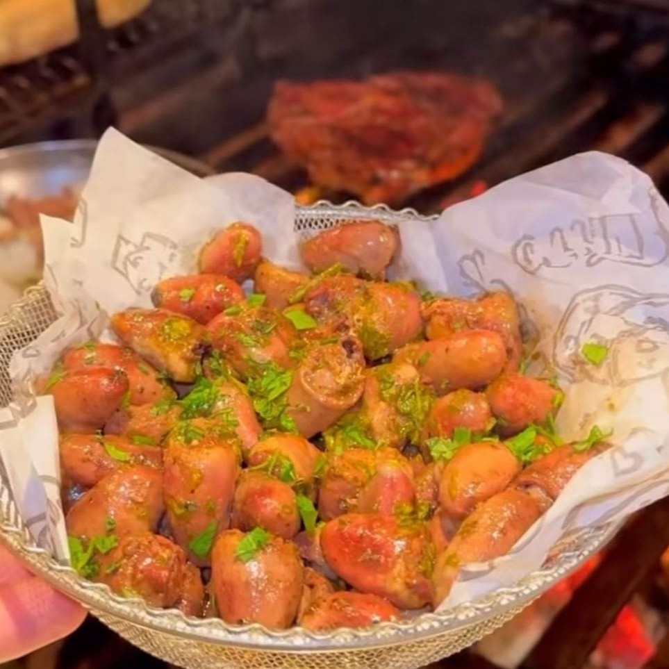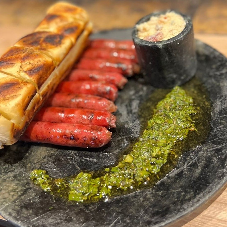 1 unidade de pão de alho Porção Linguiça Cara Preta: aprox 300gr de linguiça de costela angus. Acompanha: farofa e chimichurri.