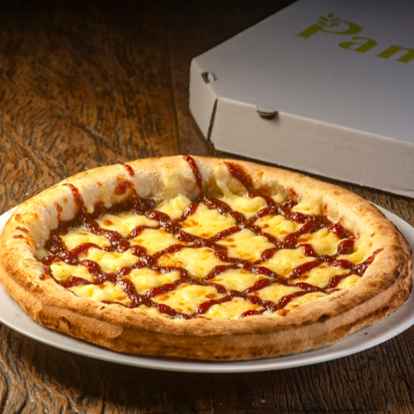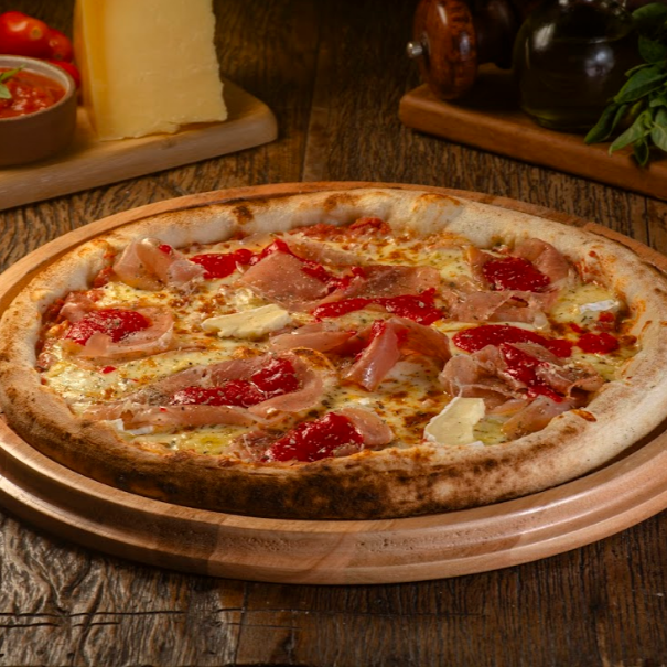 Molho de Tomate, Queijo Mussarela, Mussarela de Búfala, Queijo Brie, Presunto de Parma, Geleia de Pimenta e Orégano.