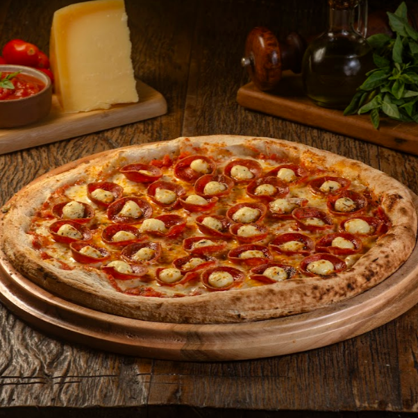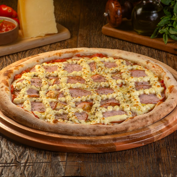 Molho de Tomate, Mussarela, Pepperoni, Catupiry e Orégano.