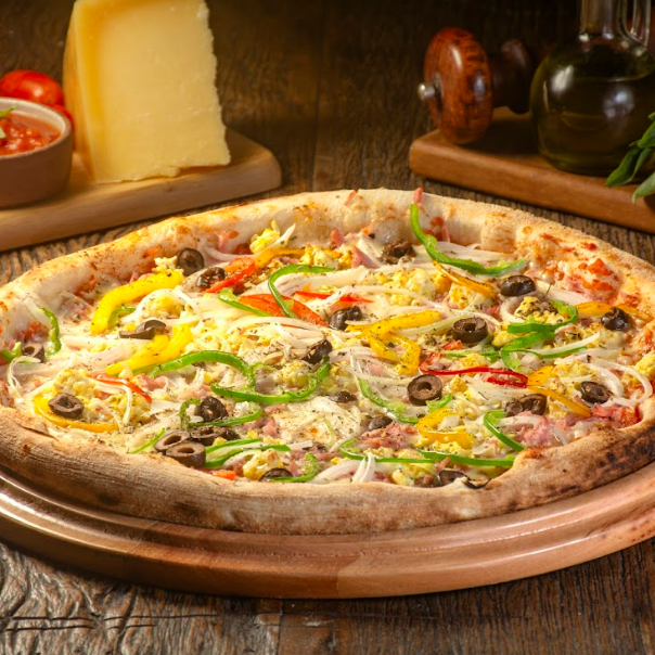 Molho de Tomate, Queijo Mussarela, Presunto, Ovos, Azeitona Preta, Pimentões Coloridos, Cebola e Orégano.
