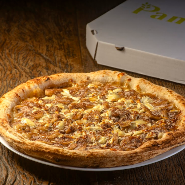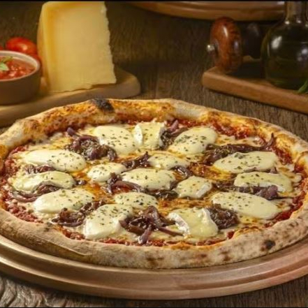 Molho de Tomate, Queijo Mussarela, Mussarela de Búfala, Queijo Brie, Cebola Roxa Caramelizada e Orégano.