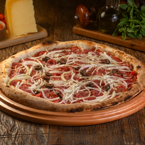 Molho de Tomate, Queijo Mussarela, Cebola, Azeitonas Pretas, Calabresa e Orégano.
